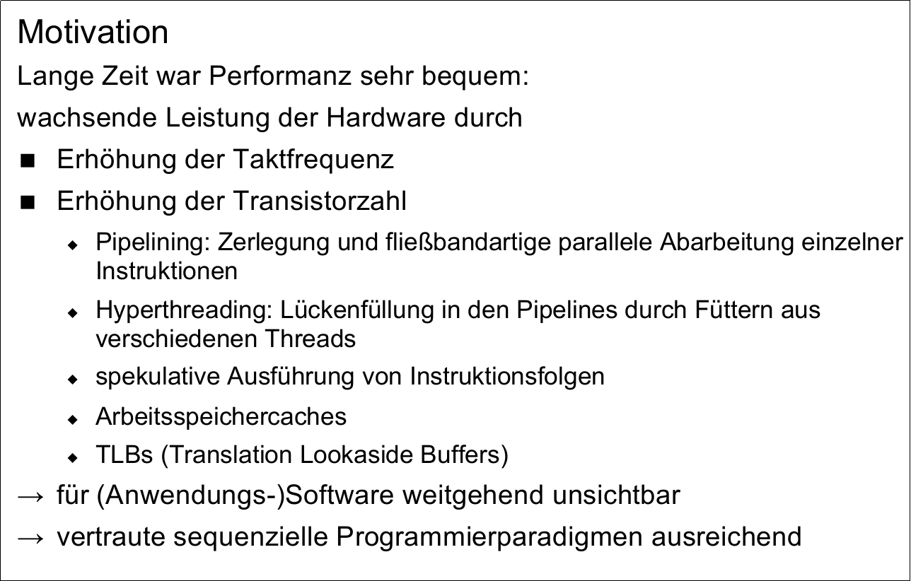| Wissensbasierte Modelle (Transaktionaler Speicher) (Benutzung von Semaphoren) (Ausflugsende - Zwischenfazit) (Leistungssteigerung durch Paradigmenwechsel der Prozessorarchitektur: Multicores) | - Paradigmenwechsel der Software notwendig: parallele/verteilte Algorithmen - hochparallele, nicht sperrende Synchronisationsmodelle - Transaktionaler Speicher |