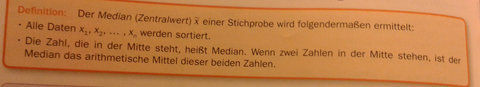 | Was ist der Median und wie berechne ich ihn? | Auch Zentralwert genannt Ordne die Zahl der Größe nach von klein nach groß (Zb. 4 7 1 6 2 -> 1 2 5 6 7), die Zahl die nun in der Mitte steht ist der Median. Falls es zwei Zahlen sind die in der Mitte stehen, rechnet man das arithmetische Mittel der beiden Zahlen aus (Mittelwert). |