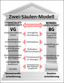 Danach besteht jeder Sender aus zwei rechtlich selbständigen Einrichtungen: der Veranstaltergemeinschaft (VG) und der Betriebsgesellschaft (BG).