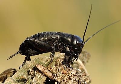 | Feldgrille, Gryllus campestris; Vdtibien außen großes innen kleines Trommelfell, Körper schwarz, glatt und glänzend, Htschenkel unten rot | |