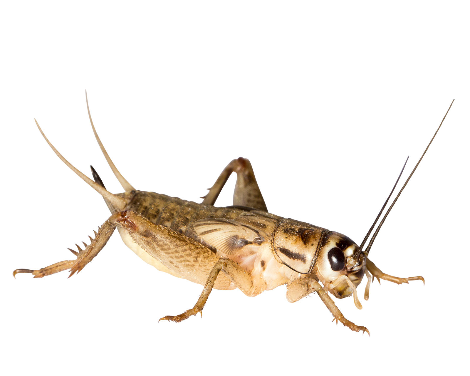 Heimchen, Acheta domesticus: Gelbbraun mit dunkler Zeichnung, am Kopf mit schwarzen Querbinden, Flügel so lang wie Hinterleib |