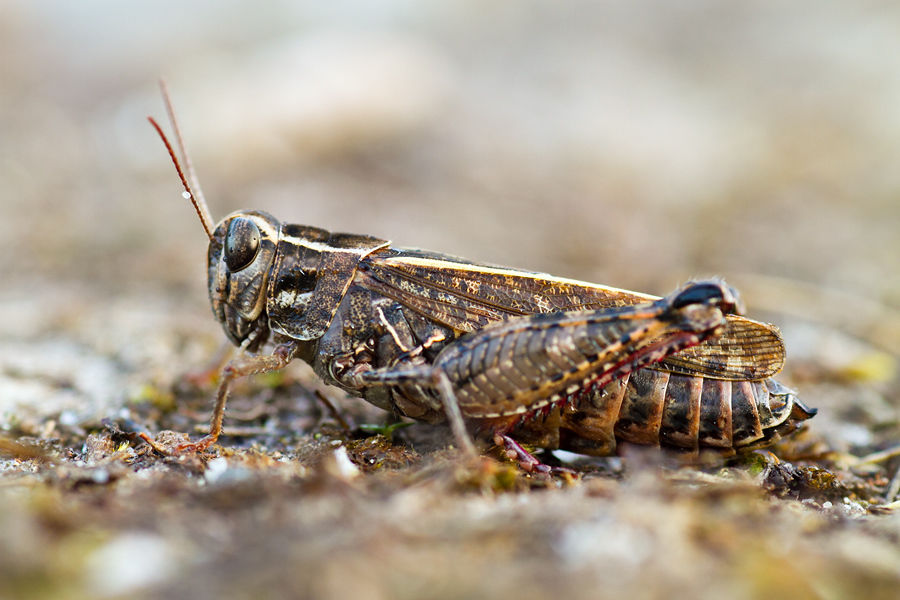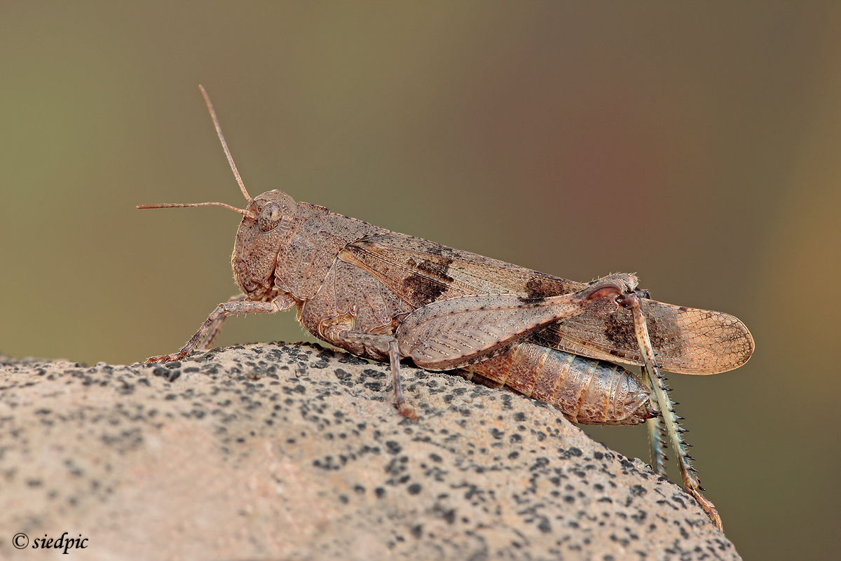 | Ödlandschrecken, Oedipodinae: Stufe am Hinterfemur, Stirn bildet mit dem Scheitel stumpfen bis rechten Winkel | |