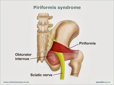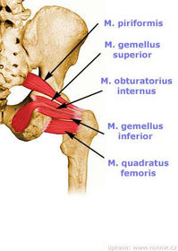 | Äußere Hüftmuskulatur: M. piriformis: Ursprung: Facies pelvina des Os sacrum Ansatz:Spitze des Trochanter mayor am Femur Innervation:direkte Äste aus dem Plexus sacralis L5 – S2 Funktion: macht Außenrotation, Abduktion und Extension im Hüftgelenk, und stabilisiert das Hüftgelenk | |