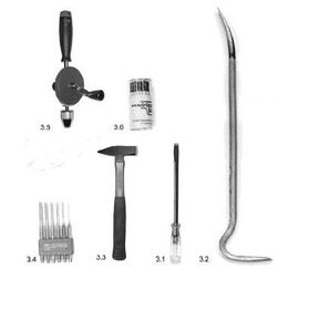 | Der Einbrecher versucht Zutritt zu erlangen mit Hilfe eines Kuhfusses, eines zusätzlichen Schraubendrehers sowie Handwerkzeugen, wie einem kleinen Hammer, Splinttreiber und einem mechanischen Bohrer. | Täterprofil RC 3 |