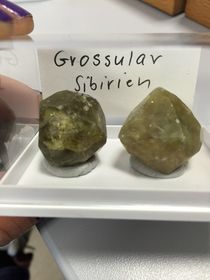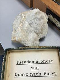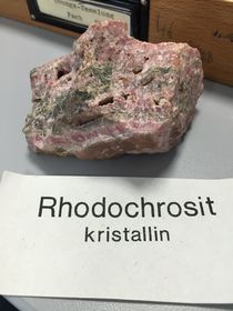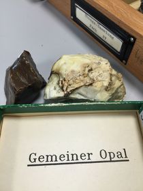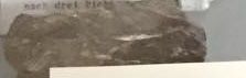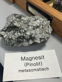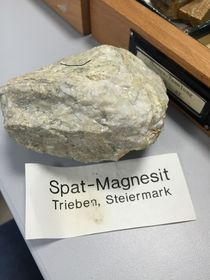 | Magnesit (Pinolit) meist feinkörnig, derb, selten rhomboedrische Kristalle 3 vollkommende Spaltbarkeiten (Spaltrhomboeder) | |