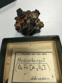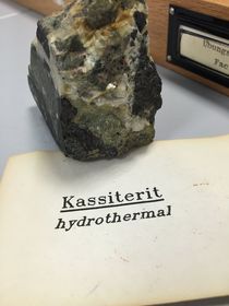 | Kassiterit prismatische Kristalle, oft verzwillingt, Habitus ist temperatur abhängig uneben, eine undeutliche Spaltbarkeit | |