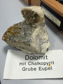 | Dolomit oft in gut ausgebildeten Kristallen mit gebogenen Flächen (manchmal in Sattelform) vollkommene Spaltbarkeiten, die sich in Winkeln von ca. 75° bzw. 105° schneiden (Splatrhomboeder) | |