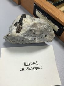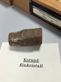 | Korund Einkristall tafelige bis säulige Kristalle mit sechseckigem Querschnitt; oft tonnenförmig muscheliger Bruch, oft jedoch 2 Teilbarkeiten (Scheinspaltbarkeit) infolge polysynthetischer Verzwillingung | |