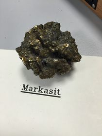 | Markasit meist tafelige oder prismatische Kristalle, die häufig radialstrahlige, sperrförmige, oder hahnenkammartige Aggregate bilden uneben (schlechte) Spaltbarkeit, kaum unterschied zu Pyrit | |