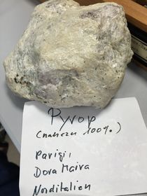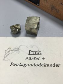 | Pryrit meist gut ausgebildete würfelige, pentagondodekaedrische oder oktaedrische Kristalle; würfelige Kristalle weisen meist eine Striemung parallel der Kanten auf. muscheliger Bruch | |