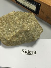 | Siderit rhomboedrische Kristalle, oft mit gebogenen Flächen, oft in kugeligen Konkretionen; auch derb 3 vollkommende Spaltbarkeiten (Spaltrhomboeder) | |