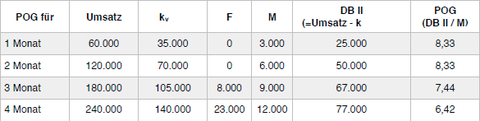 | POG mit Fixkosten | • POG2_gesamt = (Umsatzerlöse - kumul. sonst. variable Stückkosten - Fixkosten) / Mengeneinsatz = (E - kv_gesamt - KF) / M |