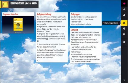 | lino: Virtuelle Pinnwand (zum Umdrehen klicken) | Virtuelle Pinnwand mit Post-its. Team-Boards, private Boards, Videos. Gut für: Brainstorming/Clustering von Arbeitsgruppen an unterschiedlichen Standorten. Nachteile: keine Chat-Möglichkeit, keine Kommentare. |