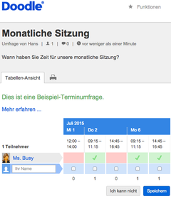 | Doodle: Termine finden | Schnell und einfach Termine mit vielen Teilnehmern per Web-Umfrage finden. Login mit Google-Konto, Teilnehmer benötigen kein Login. Gut für: Terminfindung in Lern- und Arbeitsgruppen |