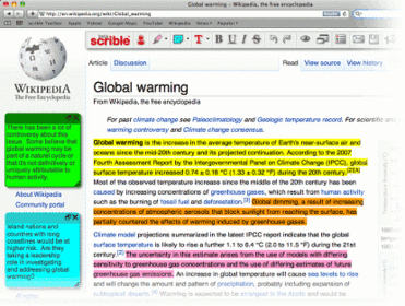 | scrible: Websites markieren, annotieren und diskutieren | Social Bookmarking Tool, ähnlich wie ->Diigo. Websites und Artikel aller Art allein oder in Gruppen annotieren, markieren, organisieren, teilen. Volltextsuche über gespeicherte Notizen und den Inhalt der Websites/Texte möglich. Gut für: Recherche, strukturierte Lesezeichen in der ->Cloud. |