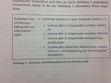 | Gläubigerschutz durch Ausschüttungssperre bei GmbHs | Ausshüttungen sind solange zulässig, solange das Eigenkapital nicht kleiner der Nennwert aller Gesellschaftanteile ist. (Stammkapital) |