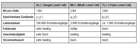 | TLC, MLC, SLC im Zusammenhang mit SSD | TLC-Speicherzellen (triple-level cell) sind Speicherzellen der Bauart NAND-Flash, die 3 Bits pro Speicherzelle speichern können. 1000 – 3000 Schreibvorgänge je Zelle MLC-Speicherzellen (multi-level cell) sind Speicherzellen, in denen prinzipiell mehr als ein Bit pro Zelle gespeichert werden können. Das Speichern von mehr als einem Bit wird erreicht, indem anders als bei konventionellen SLC-Speicherzellen mehr als zwei Zustände– entladenes und geladenes Floating-Gate – in einer Zelle gespeichert werden. 5000 – 10000 Schreibvorgänge je Zelle SLC-Speicherzellen ( single-level cell) sind Speicherzellen, die aus NAND-Flash bestehen und jeweils ein Bit speichern. Es wird hierbei nur ein Spannungslevel pro Transistor verwendet. SLC-SSD-Speicher ist deutlich teurer als MLC-SSD-Speicher und wird bei schreibintensiven Speicheranforderungen benutzt. 100000 – 5 Mio. Schreibvorgänge |