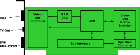 | Video RAM | Maßgeblich entscheidend für maximale Auflösung und Farbtiefe: Speicherbedarf = horizontale Auflösung * vertikale Auflösung * Farbtiefe (in Bit) Auf ihm werden die Bildelemente in einzelne Bildpunkte zerlegt und gespeichert Der Video-RAM-Speicher ist speziell für Grafikanwendungen konzipiert Der Video-RAM-Speicher verkürzt die Zugriffszeiten erheblich Der Video-RAM-Speicher dient zur Ablage von Pixel und Texturen Shared Memory, d.h der Speicher wird vom Arbeitsspeicher geklaut kommt bei älteren Grafikkarten noch vor bzw. bei Low-Budget-PC's |