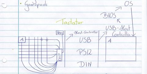 | Funktionsweise einer Tastatur | Die einzelnen Tasten sind in einer elektrischen Matrix aus Reihen-Leitungen und Spalten-Leitungen angeordnet. Wird eine Taste gedrückt, so wird eine bestimmte Zeile mit einer bestimmten Spalte elektrisch verbunden. Diese Verbindung wertet ein Microcontroller aus und schickt diese Information zum Rechner. |