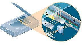 | Flachbettscanner | Strahlengang für einen Bildpunkt: Lampe 1 belichtet die Vorlage. Spiegelsystem 2 zerlegt reflektiertes Licht in Grundfarben Rot, Grün, Blau. Linse 3 projiziert Grundfarben auf CCD-Zeile 4. |