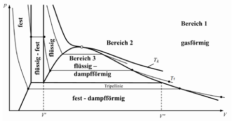 | Skizzieren Sie im p,v-Diagramm die drei Zweiphasengebiete und die Tripellinie! Zeichen Sie auch die kritische Isotherme (Tk), eine Isotherme T1<Tk |