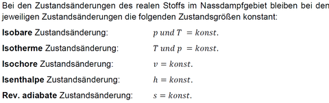 | Welche Zustandsgrößen bleiben jeweils bei einer isobaren, isothermen, isochoren, isenthalpen und reversibel adiabaten Zustandsänderung eines realen Stoffes im Nassdampfgebiet konstant? |