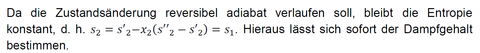 | Eine adiabate Expansion findet von p1 auf p2 statt. Stellen Sie die Zustandsänderung für eine reversible adiabate und eine adiabat reibungsbehaftete Änderung in einem T,s-Diagramm dar. |