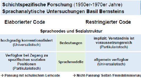 | Allgemeine Bestimmung der Codes: | Elaborierter Code: - Grammatisch variabel, präzise bezeichnend und beschreibend - variabel; geplantes Sprechen - Kontextunabhängig: Funktional in jedem Interaktionskontext - Expliziter Ausdruck besonderer Absichten und Beziehungsaspekte |