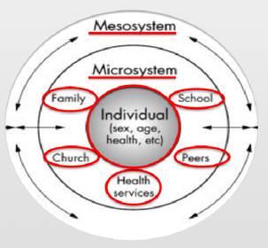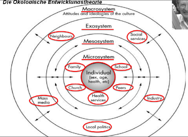 | Zusätzliche sozialökologische Parameter: Die Ökologische Entwicklungstheorie von Urie Bronfenbrenner: | - der amerikanische Sozialpsychologe Urie Bronfenbrenner (1917-2005) gilt als Begründer der ökologischen Entwicklungstheorie - Bronfenbrenner entwickelt ein Modell der schrittweisen Erschließung von Lebensräumen – von den unmittelbaren zu den entfernten Lebensbereichen – durch einen Menschen |