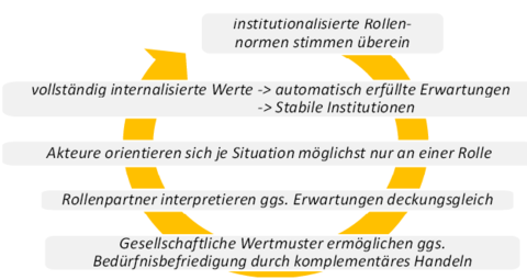 | Voraussetzungen erfolgreichen Rollenhandelns nach der funktionalistischen Rollentheorie: | Übereinstimmung von Erwartungen, Situationsdeutungen und Interessen: |
