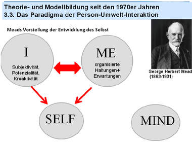 | Meads Sozial-Behaviorismus: | - das Soziale ist eine Quelle des Lernens und der Entwicklung des Selbst - Lernen beruht auf wechselseitigen Reizen und Reaktionen, auf kognitiver Verarbeitung/innerer Organisation von Erfahrungen (Haltungen; z.B. Pünktlichkeit) |