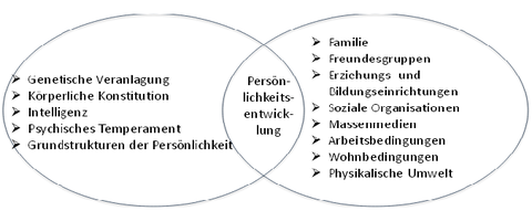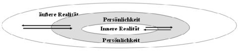 | 2. Sozialisation ist ein Prozess der Persönlichkeitsentwicklung in wechselseitiger Abhängigkeit von körperlichen und psychischen Grundstrukturen (→ innere Realität) und den sozialen und physikalischen Umweltbedingungen (→ äußere Realität). | |