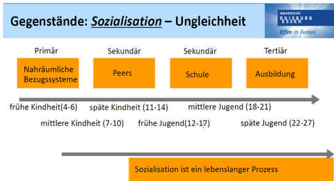 | Unterteilung der Sozialisation in Phasen nach verschiedenen Kriterien: - Altersstufen - Institutionalisierung des Lebenslaufs - Entwicklungsaufgabe pro Lebensphase | |