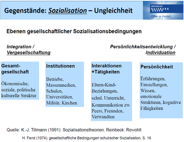 | Die doppelte Bedeutung von Sozialisation | Integration/Vergesellschaftung: - Integration von Menschen in ein soziales Gefüge - Erlernen grundlegender Kompetenzen, um in einem sozialen Feld/in einer sozialen Gruppe handeln zu können |