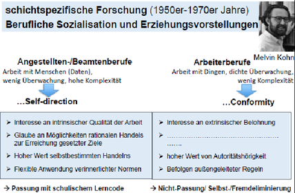 | Boom der schichtspezifischen Sozialisationsforschung (schichtspezifische Forschung 1950er-70er: | - Untersuchungen zur schichtspezifischen Sozialisation setzten nach dem zweiten Weltkrieg vorrangig im angelsächsischen Sprachraum ein und erreichten zu Beginn der 60er Jahre ihren Höhepunkt - In Deutschland begann ihre akademische Rezeptio |
