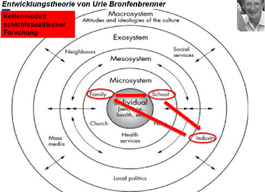 | Bronfenbrenners Modell der schrittweisen Erschließung von Lebensräumen füllt Desiderata der schichtspezifischen Forschung: | - zuvor fehlenden Variablen/Sozialisationsumwelten sind eingeschlossen - die Interpendenz der Systeme wird sichtbar (keine einseitige Determination) - Umwelten sind nicht allein Medien der Verinnerlichung äußerer Zwänge und Normen, sondern Lebenswelten, die von Menschen gestaltet werden - Individuen erschließen Lebensräume aktiv - von Schichtspezifika abweichende Entwicklungspfade (Auf-/Abstiege) sind vorstellbar |