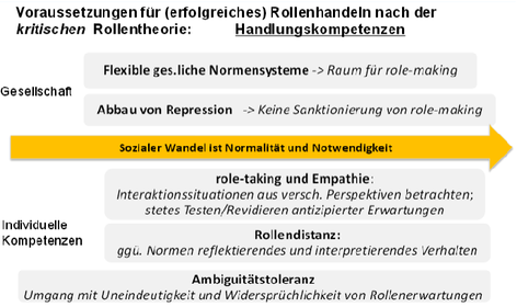 | Die kritische Rollentheorie: | Der Erfolg eines Sozialisationsprozesses wird bemessen an der Annäherung verinnerlichter Rollenmuster an gesellschaftliche/institutionelle Erwartungen: - Kritik am Gesellschaftsbild: es läuft auf die Annahme einer starren und saktionierenden Gesellschaftsform hinaus → Strukturfunktionalismus - Kritik am Handlungsmodell: Erfolgreiches Rollenhandeln scheint nur bei vollständiger Übereinstimmung von Erwartungen, Situationsdeutungen und Interessen möglich |