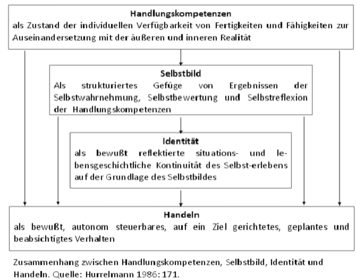 | Produktive Realitätsverarbeitung beschreibt die Fähigkeit, sich selbst-reflexiv Realität anzueignen | „Mit voranschreitender Persönlichkeitsentwicklung im Kindes- und Jugendalter wird die Aneignungs- und Verarbeitungsfähigkeit eines Menschen normalerweise immer weiter gesteigert,sodass es zu einem wachsenden individuellen Verständnis der äußeren Realität, einer komplexen gedanklichen Rekonstruktion situativer Gegebenheiten und einer effektiveren Verarbeitung von Wahrnehmungen und Interpretation kommt.“ (Hurrelmann 1986) |