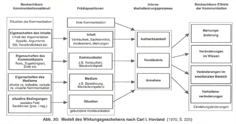 | Rezeption III: Einstellung Wirkungsforschung - Einstellungskonzept Yale-Ansatz zur Einstellungsänderung: Grundmodell der Massenkommunikationsforschung (Grafik) | 3 Faktorengruppen bilden den Effekt der Massenkommunikation |