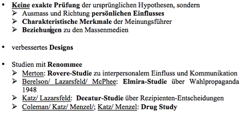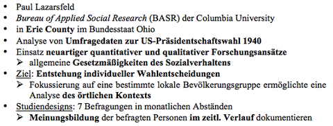 | Rezeption III: Einstellung Two-Step-Flow People's Choice-Studie / Erie-County-Studie (Lazarsfeld, Berelson, Gaudet, 1940): Konzepte | |