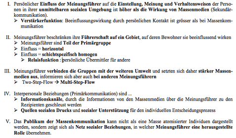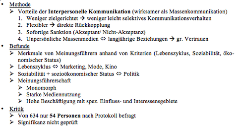 | Rezeption III: Einstellung Two-Step-Flow Grafik | „Ideas often flow from radio and print to the opinion leaders and from them to the less active sections oft he population.” |