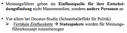| Rezeption III: Einstellung Meinungsführerkonzept Decatur-Studie (Katz/ Lazarsfeld, 1945/6): Methode, Befunde, Kritik | |