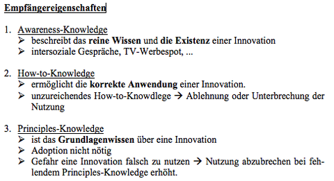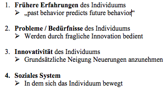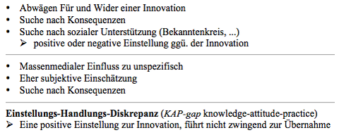 | Wirkung I: Diffusionsforschung Zeit (Mikroebene) Innovations-Entscheidungs-Prozess (Rogers 2003) 1. Wissen: Eigenschaften der Übernehmers | |