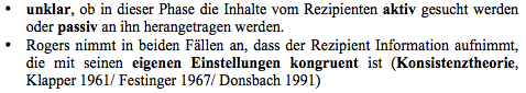 | Wirkung I: Diffusionsforschung Zeit (Mikroebene) Innovations-Entscheidungs-Prozess (Rogers 2003) Konsistenztheorie: Selektive Aufnahme von Inhalten | |