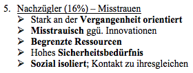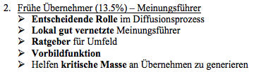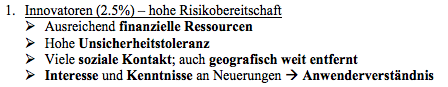 | Wirkung I: Diffusionsforschung Zeit (Makroebene) Innovations-Entscheidungs-Prozess (Rogers 2003) Übernehmerkategorien: Nachzügler | |
