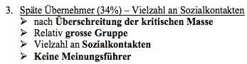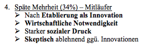 | Wirkung I: Diffusionsforschung Zeit (Makroebene) Innovations-Entscheidungs-Prozess (Rogers 2003) Übernehmerkategorien: Späte Mehrheit | asd |