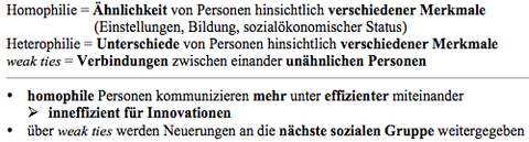 | Wirkung I: Diffusionsforschung Kommunikationskanäle Homophilie ⇔ Heterophilie | |