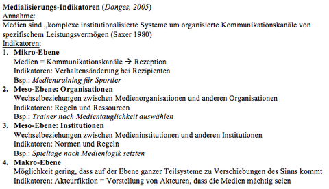| Medialisierung Forschung zu Medialisierungprozessen Mediatisierungs-Indikatoren (Donges, 2005) | |