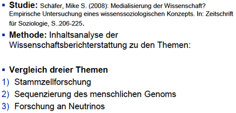 | Medialisierung Medialisierung von Wissenschaft Wissenschaftsberichterstattung (Schäfer, 2008): Studie & Methoden | |