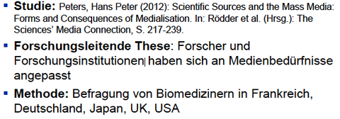 | Medialisierung Medialisierung von Wissenschaft Forscher und Forschungsinstitutionen (Peters, 2012): Studie, These, Methode | |